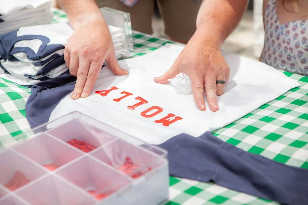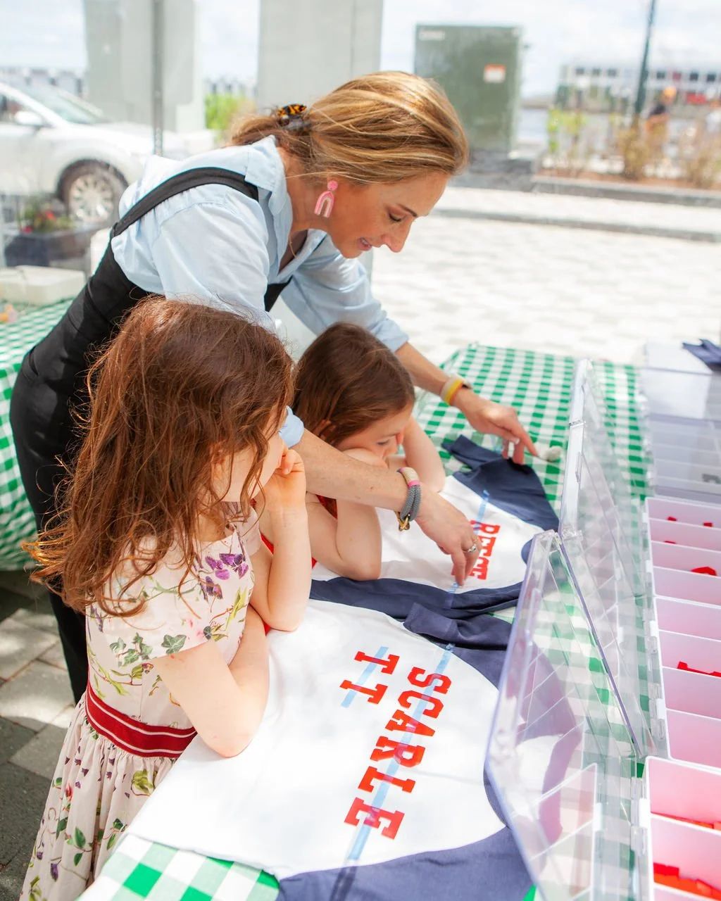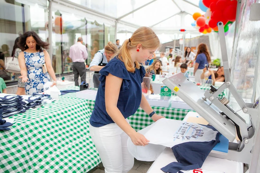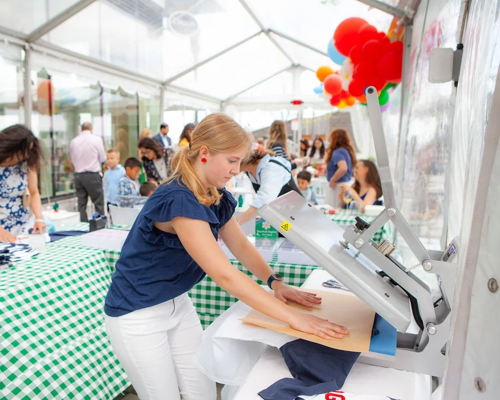A nod to spring and game-day nostalgia—kids designed their own custom raglan tees, choosing colors and layouts while our team pressed each piece on site.